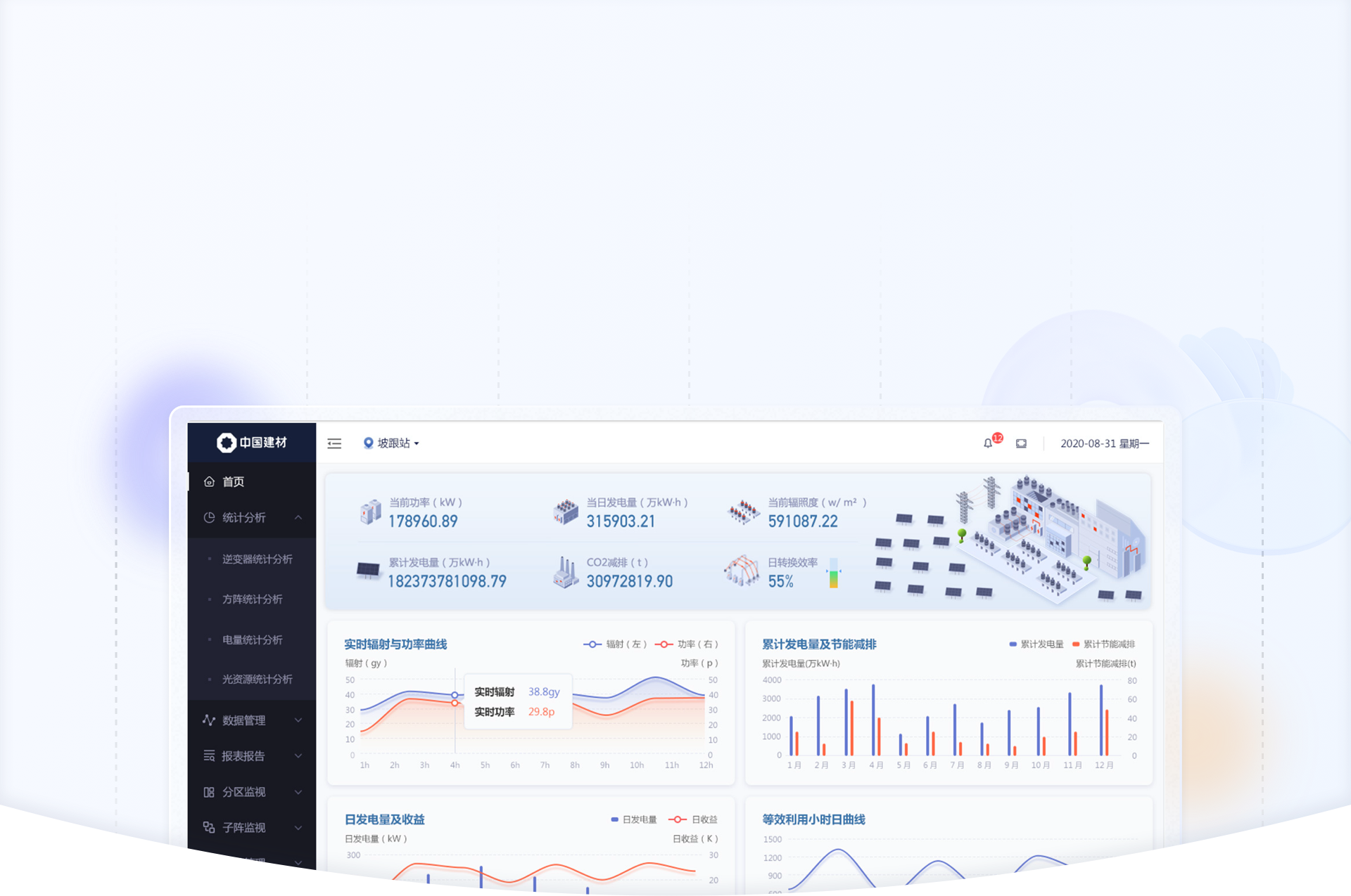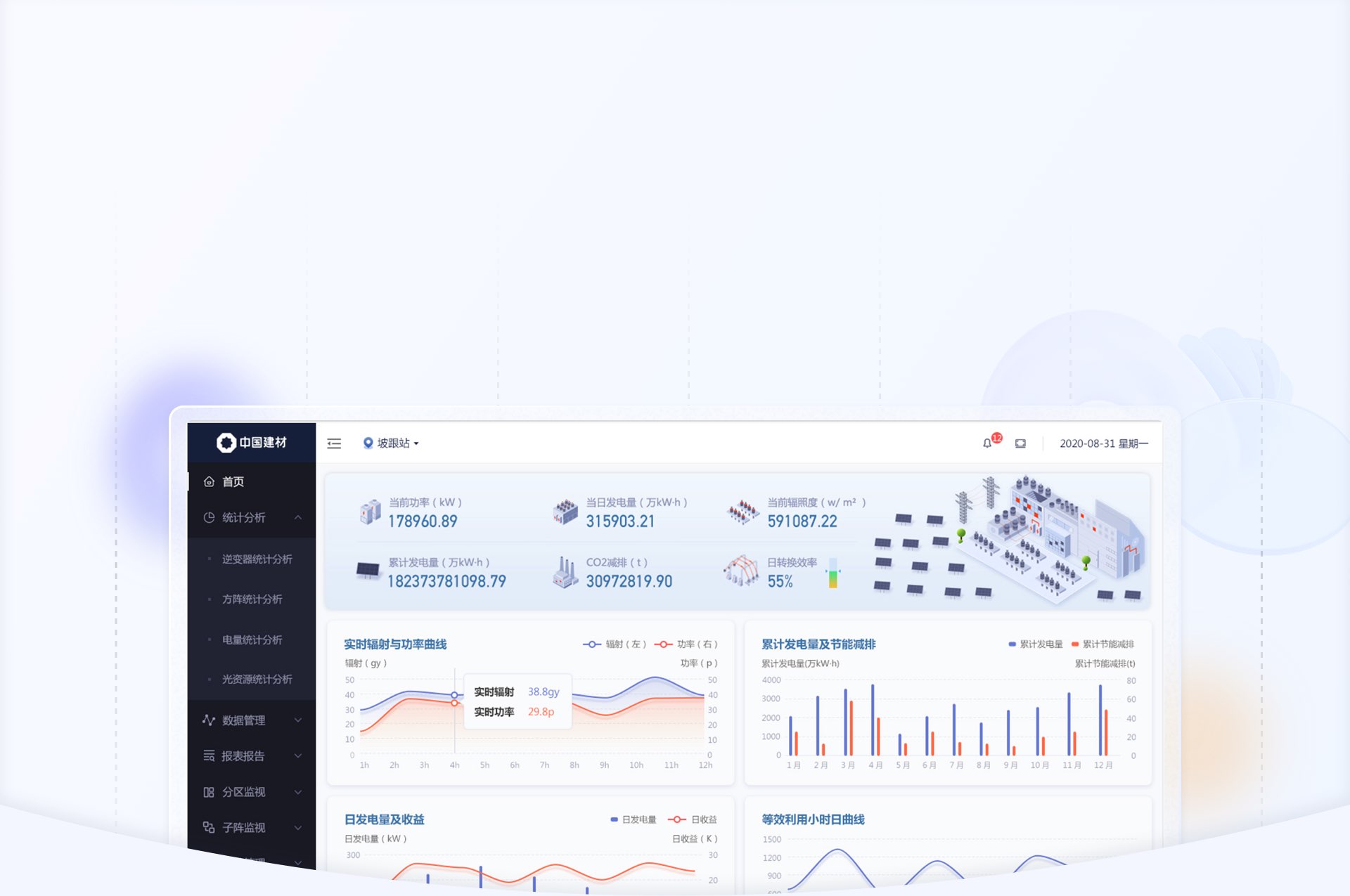 設(shè)計前期,藍藍設(shè)計通過問卷調(diào)查方式確定客戶風(fēng)格和喜好,并和客戶溝通頁面交互邏輯和優(yōu)化方法,確定交互方式后,再進入視覺設(shè)計階段,這樣可以快速確定設(shè)計方向,節(jié)省大量時間。視覺設(shè)計方面,藍藍設(shè)計嘗試將2.5d圖標融入界面設(shè)計中,通過立體化,場景化的圖標,更加直觀地展示出產(chǎn)品功能屬性和使用場景,為光伏電站UI設(shè)計方向提供藍藍的設(shè)計方案。
