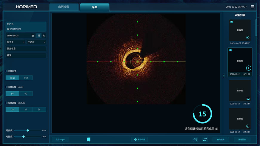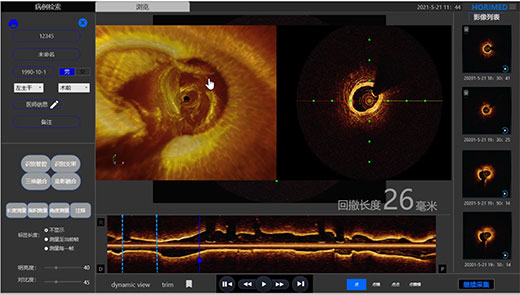恒宇和藍藍設計合作,對OCT系統(tǒng)UI操作界面進行了創(chuàng)新,采用的UI界面結合了16:9寬屏優(yōu)勢,搭載了管腔識別、支架識別、三維重建、造影融合等功能,軟件簡潔直觀的界面和多功能算法可幫助術者快速精準的做出診療決策,更符合國內醫(yī)生界面操作習慣,從而優(yōu)化醫(yī)生和病人的診療體驗。