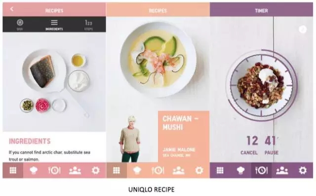 優(yōu)衣庫出品的RECIPE,是一個讓人眼前一亮的設(shè)計案例,多彩色的設(shè)計風(fēng)格融入到整個APP中,不論是切換標(biāo)簽頁,還是在內(nèi)容組塊中滾動,都會變更不同的主題色。色彩切換的時候,還會有淡入淡出的效果,讓切換變得自然而然,完全不生硬。