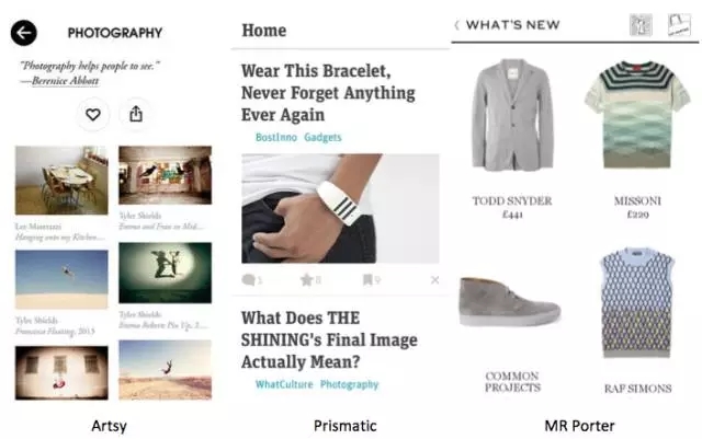 Artsy的圖片瀑布流,完全沒有用到線和面來區(qū)分信息組塊,而就是用內(nèi)容本身做排版,用戶可以更加集中注意力于圖片內(nèi)容上。Prismatic利用字體排版,盡可能的內(nèi)容前置,弱化圖標(biāo)和操作,讓用戶更集中注意力于內(nèi)容閱讀上。而MR Porter則利用商品圖片、名稱和價格直接做設(shè)計,讓用戶聚焦于商品本身。