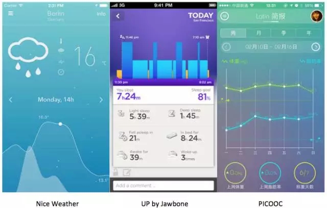 Nice Weather用曲線圖來表達(dá)溫度的變化,Jawbone UP用柱狀圖來表達(dá)每天的完成情況,PICOOC用折線圖來表達(dá)每天體重、體脂的變化。移動APP利用數(shù)據(jù)可視化,可以在更小的屏幕空間內(nèi),更立體化的展示內(nèi)容。