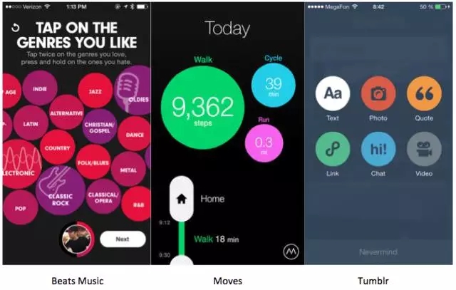 Beats Music把選擇喜歡的標(biāo)簽設(shè)計成了圓形,這就比普通的列表、矩形tag的感覺要好很多,更加趣味更具探索性。Movse每天走的步數(shù)、消耗的卡路里均用圓形承載,是數(shù)據(jù)可視化、關(guān)鍵信息顯性化的最好案例。Tumblr則把要創(chuàng)建的內(nèi)容的類型選擇,用蒙層+圓形選項按鈕來設(shè)計,讓選擇變得專注而明確,又不那么死板。