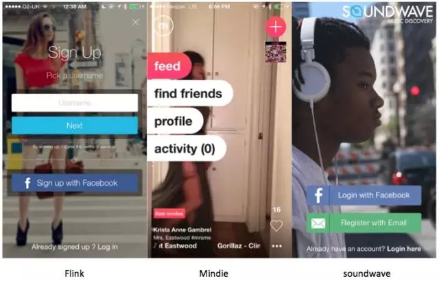 大視野背景圖風(fēng)格也分為兩種,一種像Secret、The Whole Pantry這樣的,內(nèi)容區(qū)塊中采用大視野背景圖,好處是可以利用圖片做區(qū)塊分割,難度是圖片拼接后的效果不一定好看,所以可能還需要配合描邊、留白等設(shè)計手段優(yōu)化拼接。另外一種就是想Vsco、Flink、Mindie、Soundwave這樣的,全屏背景圖甚至打通狀態(tài)欄,前景做內(nèi)容排版、導(dǎo)航、操作。好處是設(shè)計非常具有生命了,所有有朋友把這種風(fēng)格也叫有計劃設(shè)計,說的就是回歸大自然的設(shè)計手法。但風(fēng)險也是很明顯的,就是前景的信息排布設(shè)計其實是有很大挑戰(zhàn)的,必經(jīng)花花綠綠的背景太過于干擾注意力,導(dǎo)致前景的文字內(nèi)容可讀性會變?nèi)?。所以需要把重要操作用明確的按鈕區(qū)隔出來,閱讀型文字跟背景圖要用明顯的反色,還是不行的話就把文字浮在半透明蒙層上,解決可讀性問題。