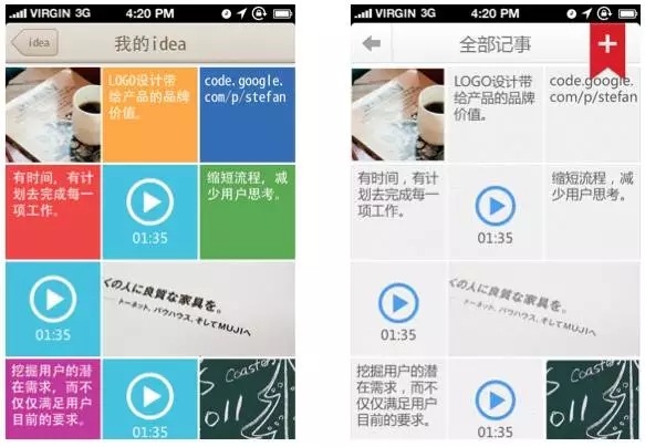 可是對于一些內(nèi)容型的APP,也許并不適用,比如GoogleKeep的多彩卡片,確實是在內(nèi)容閱讀上會起到反效果。百度云記事本第一版設(shè)計也是多彩色的,但是后來考慮到文字記事比較多,為提供良好的文字閱讀體驗,還是把多彩色改成灰白色微質(zhì)感的設(shè)計。