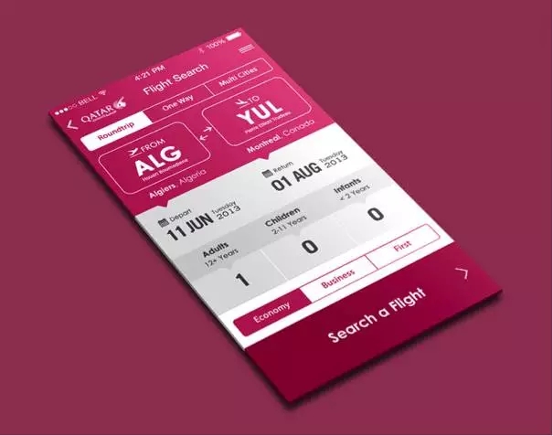 卡塔爾公司航空就是這樣的設(shè)計案例,整個界面采用粉色的主色調(diào),從標(biāo)題欄到標(biāo)簽頁,從操作按鈕到提示信息,除了黑白灰之外,全部采用粉色設(shè)計,這種簡介的的配色風(fēng)格,反倒起到了很好的信息傳達(dá)效果,也具有良好的視覺表現(xiàn)力,設(shè)計師在內(nèi)容排版上的技巧實在是加分。
