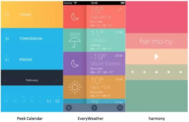 而Peek Calendar、EveryWeather和Harmony這三個APP,是列表多彩色的設(shè)計案例,這種列表多彩色,不知道是不是從Clear開始再度流行起立的,用鮮亮的多彩色來區(qū)分信息,確實能起到突出的效果,視覺上極其醒目。