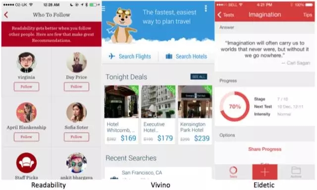 Readability采用紅色主色調(diào)設(shè)計,連提示信息背景色、線性按鈕和圖標(biāo)都采用紅色主色調(diào),界面和LOGO也完全是一個色系的。而Vivino采用藍(lán)色主色調(diào)設(shè)計,信息用深藍(lán)、淺藍(lán)加以區(qū)隔。Eidetic采用橙色主色調(diào)設(shè)計,其中的關(guān)鍵操作按鈕甚至整個用橙色提亮,信息圖標(biāo)也用深橙色、淺橙色來表達(dá)程度。 可以說唯一主色調(diào)設(shè)計手法,是真的做到了移動端APP的最小化(Minimal)設(shè)計,減少冗余信息的干擾,使用戶專注于主要信息的獲取。