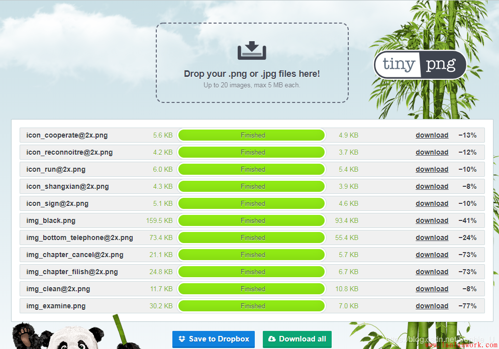 圖片小圖通過webpack可以直接轉(zhuǎn)為base64,而大圖可以通過壓縮或者換格式的方式來優(yōu)化,這里推薦一個好用的圖片壓縮工具,工具:tinyPNG,如下是圖片轉(zhuǎn)換前后對比
