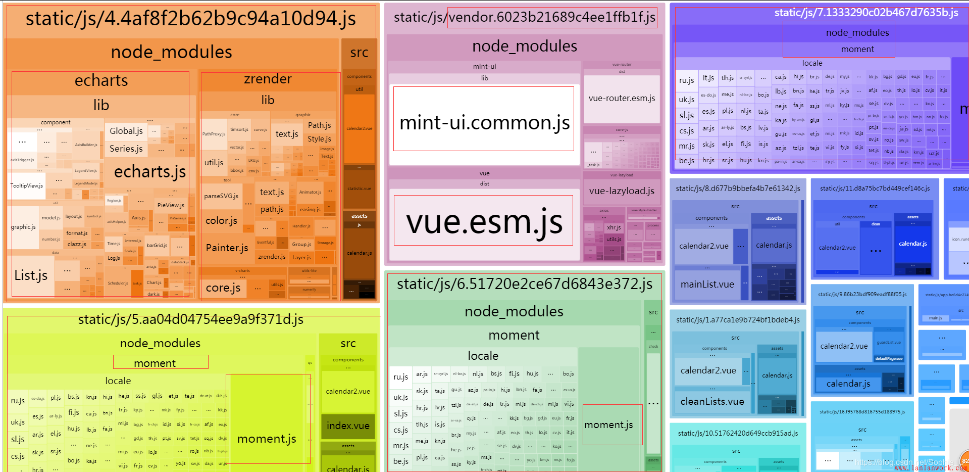 通過上圖分析可以知道打包后有幾個文件相對較大,vendor.js都知道是第三方庫文件打包形成,之前通過mint-ui按需加載會有一定的變化,后面記錄。這里著重看另兩個帶hash的js文件,這里并看不出來它為什么這么大,所以這里需要用到webpack打包分析工具來做進(jìn)一步的打包文件分析:webpack-bundle-analyzer