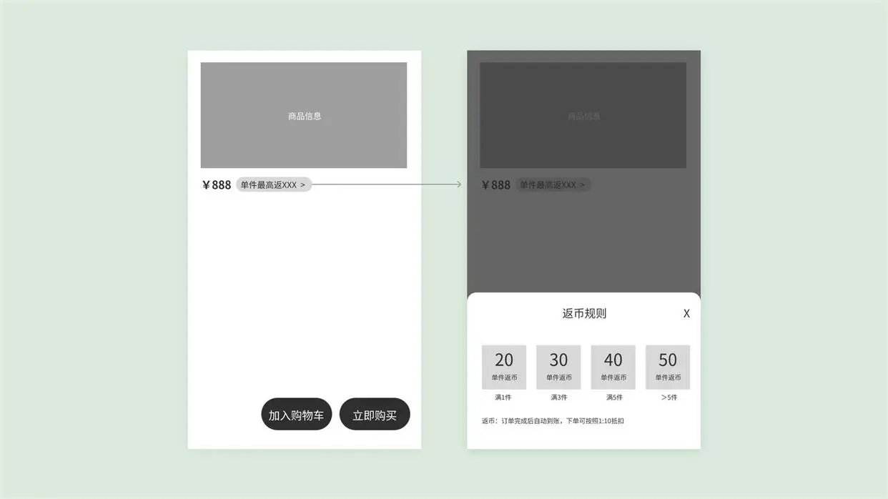 乍一看該功能都不需要設(shè)計師參與,只需要根據(jù)商品的返虛擬幣規(guī)則,將之前的單件反幣標識改成多個就行,如“1 件返 XX、3 件返 XX…”,雖然看起來好像也解決了業(yè)務(wù)訴求,但是如果僅僅考慮標識展示,而不結(jié)合需求背后的業(yè)務(wù)邏輯去思考,后續(xù)也會隨著規(guī)則的變化而帶來對應(yīng)的問題,那對于交互與UI設(shè)計師而言,針對這個需求,又該如何考慮的呢?我將分為“交互篇”與“UI篇”來分別闡述。