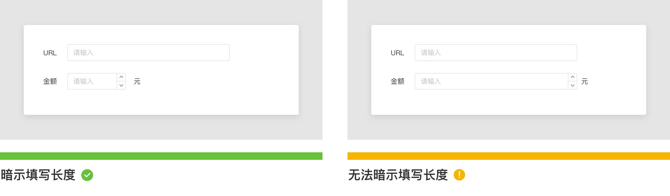 在實(shí)際業(yè)務(wù)中,設(shè)計(jì)師常常習(xí)慣把每個(gè)表單字段都設(shè)置成相同的寬度,在視覺效果上看感覺會(huì)比較統(tǒng)一,但是這種做法實(shí)際上體驗(yàn)欠佳。字段的寬度應(yīng)該向用戶暗示所需輸入內(nèi)容的長(zhǎng)度從而減輕判斷負(fù)擔(dān)。在Ant Design 4.0 系列分享的文章《整齊劃一?不如錯(cuò)落有致》中分析到錯(cuò)落有致的排版表現(xiàn)似乎比整齊劃一的左圖更舒適,因?yàn)樵谝曈X上我們更容易將右圖的空間和內(nèi)容視為一個(gè)和諧的整體。但左圖過度的對(duì)齊導(dǎo)致暗示隱性的截?cái)?,我們慣性視覺會(huì)產(chǎn)生表單字段右側(cè)空間缺了一大塊的錯(cuò)覺。