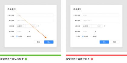 如下圖是一個(gè)彈窗類型的表單,如果根據(jù)業(yè)務(wù)訴求確認(rèn)操作重要程度強(qiáng)于取消操作,那么確認(rèn)按鈕應(yīng)該放在取消按鈕的右邊。因?yàn)榇_認(rèn)按鈕放在右側(cè)(終點(diǎn)區(qū)) 用戶關(guān)注度會(huì)更強(qiáng)。