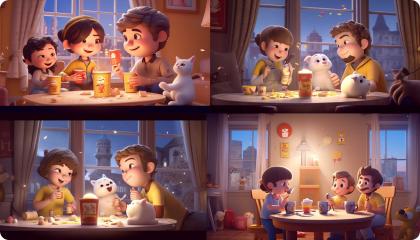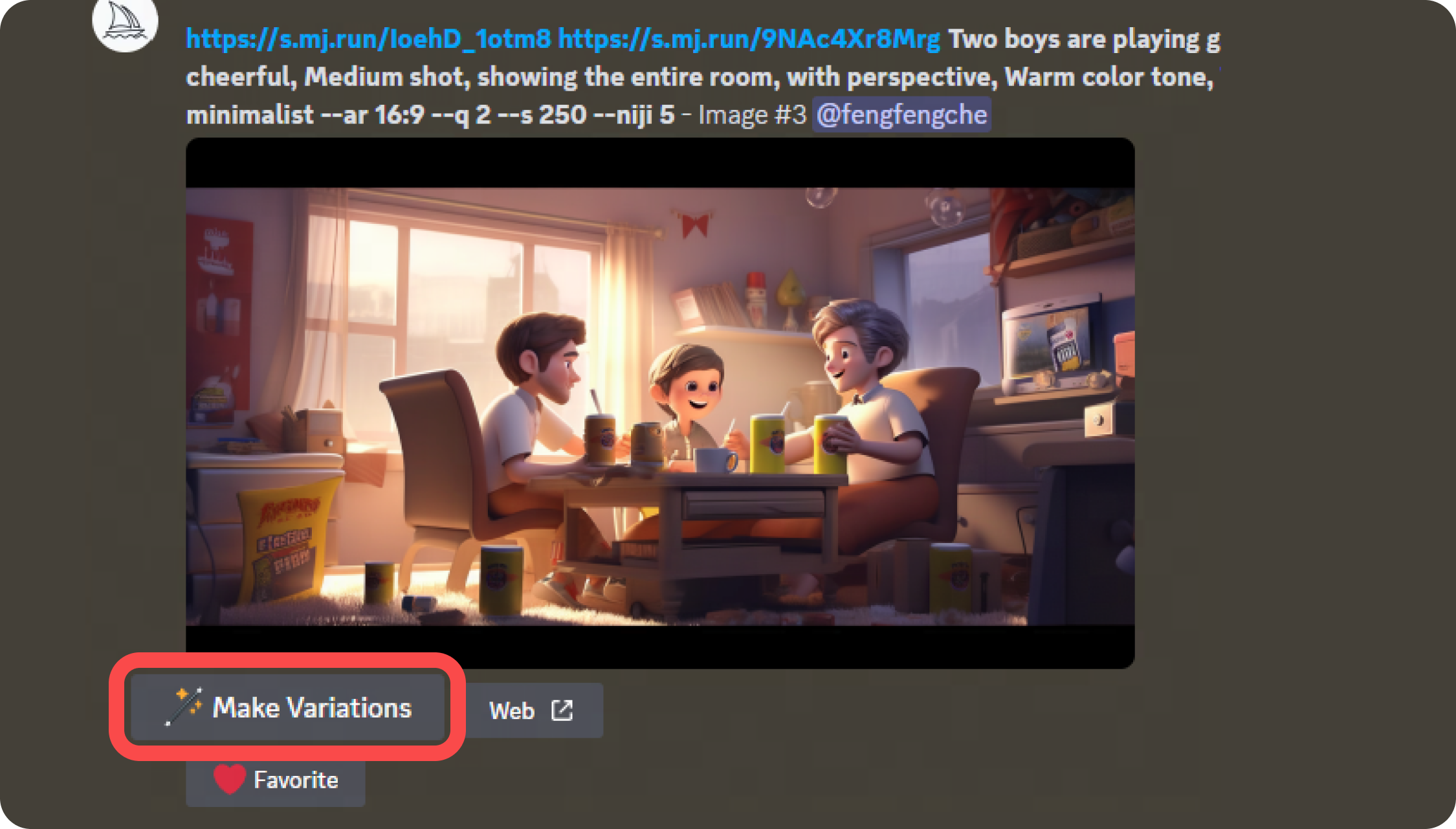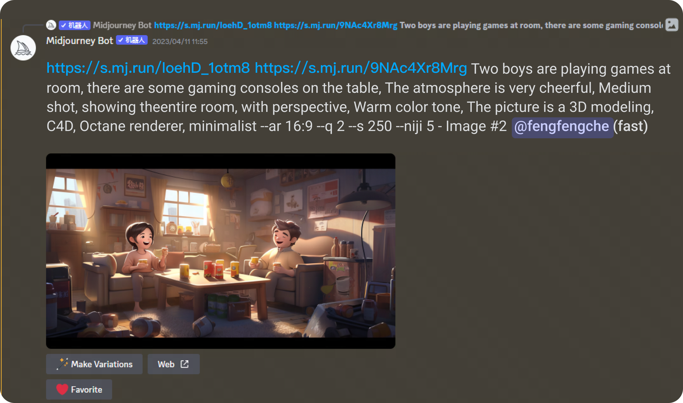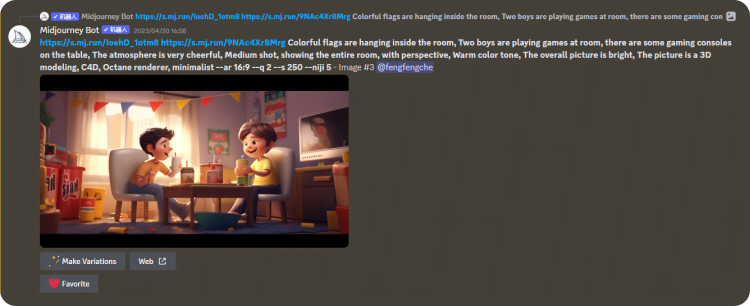 得到這張圖后,覺(jué)得畫(huà)面左上角部分有些空白,為了襯托歡快聚會(huì)的氛圍,我們決定在左上方加上掛旗。方法也是運(yùn)用Midjourney的混音模式。在關(guān)鍵詞中加入“屋子里掛著彩旗”。