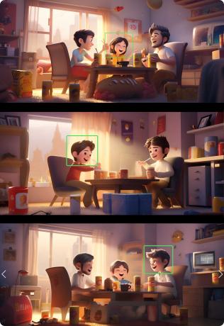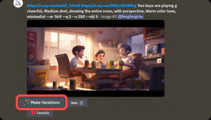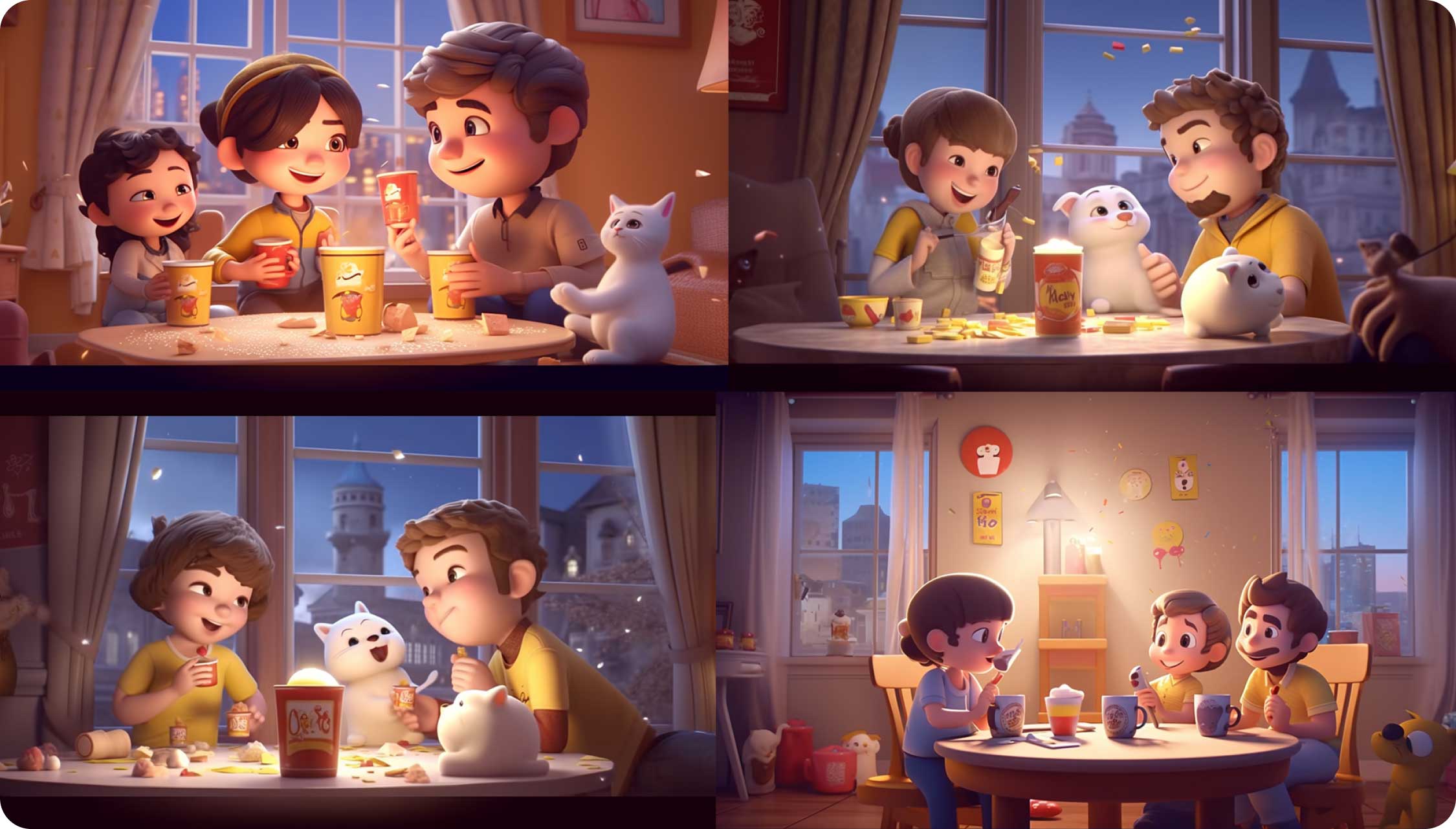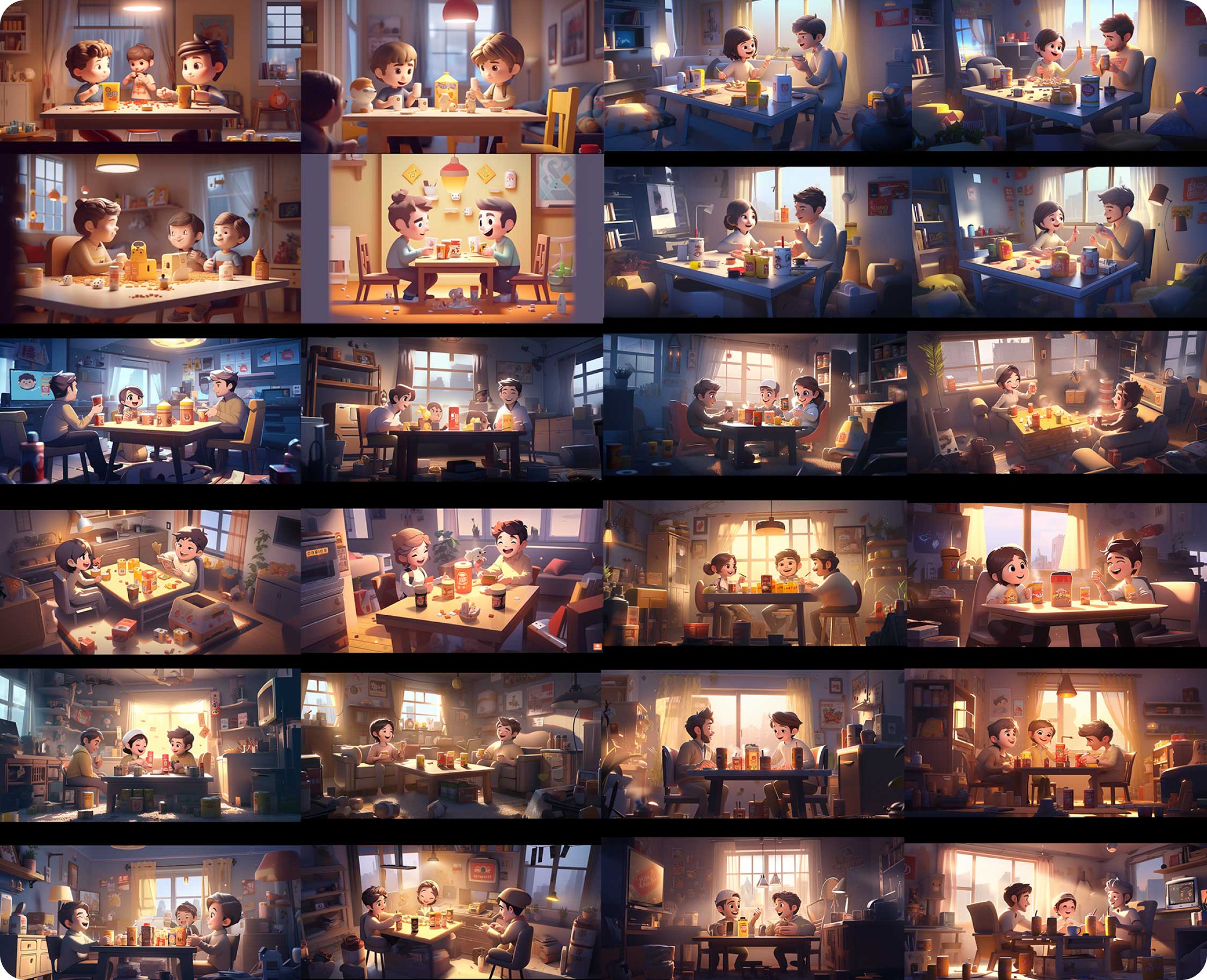 在前期,我們對(duì)構(gòu)想的畫(huà)面進(jìn)行關(guān)鍵詞的描述:“可愛(ài)帥氣的男女孩子們一起玩手機(jī),開(kāi)心地微笑著,舉起手歡呼,溫暖的房間,大型落地窗?!睂㈥P(guān)鍵詞翻譯后放入Midjourney中進(jìn)行煉圖,最終篩選了幾張氛圍還不錯(cuò)的進(jìn)行下一步操作。