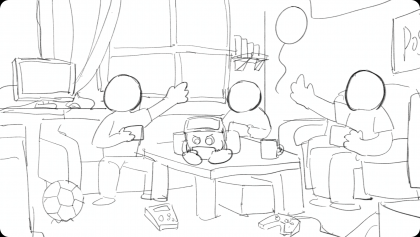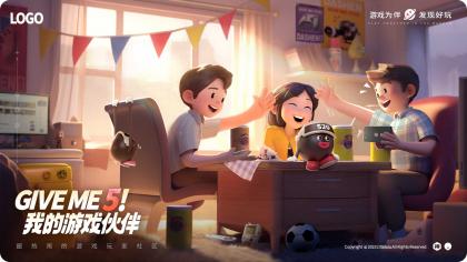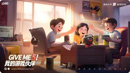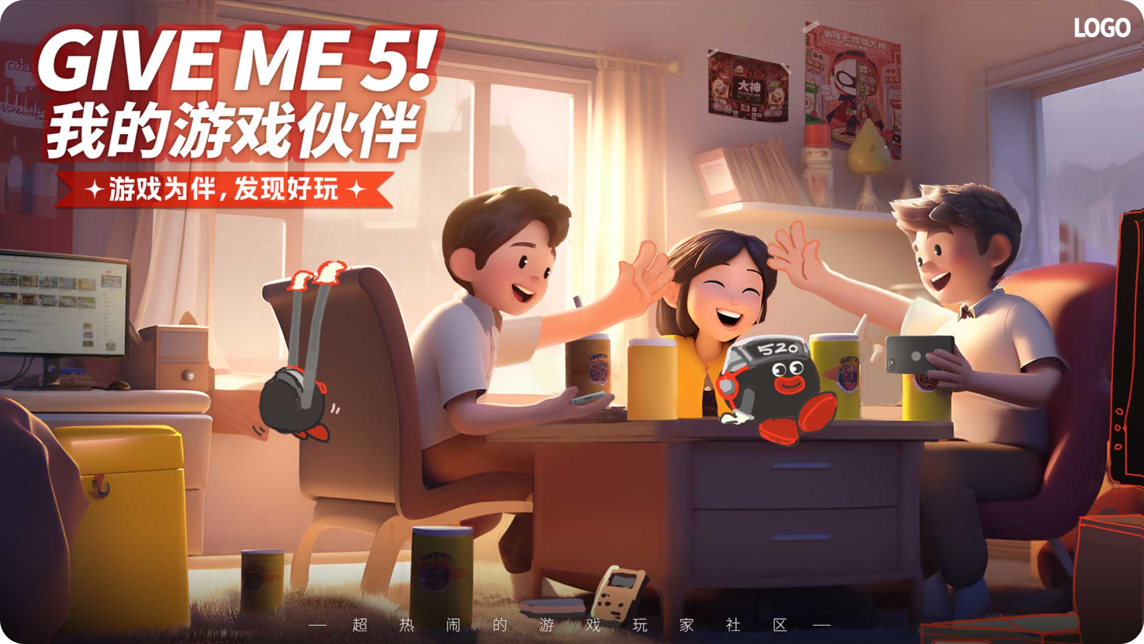 大概描繪了幾個(gè)伙伴在組隊(duì)玩游戲,因?yàn)楂@得了勝利相互擊掌(give me 5)的輕松愉快的畫(huà)面。周?chē)幸恍┖陀螒蛳嚓P(guān)的元素,IP形象也在畫(huà)面中心露出,強(qiáng)調(diào)與品牌之間的關(guān)系。