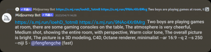 緊接著我們用之前篩選出來(lái)的其中一張或多張圖片,在Midjourney中進(jìn)行墊圖,根據(jù)之前所得結(jié)論對(duì)關(guān)鍵詞進(jìn)行優(yōu)化,再開(kāi)始新的一輪煉圖。(關(guān)鍵詞增加了“中景”、“展示整個(gè)房間”、“透視感”、“畫(huà)面明亮”。)