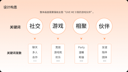 需求方希望畫(huà)面能展現(xiàn)出品牌的社交感,以“游戲伙伴”為主題,畫(huà)面表達(dá)各種不同類(lèi)型游戲伙伴,因我們的產(chǎn)品而相聚的場(chǎng)景。同時(shí)希望畫(huà)面中的人物能做出擊掌(GIVE ME 5)的動(dòng)作,以此呼應(yīng)品牌發(fā)布會(huì)的主題。