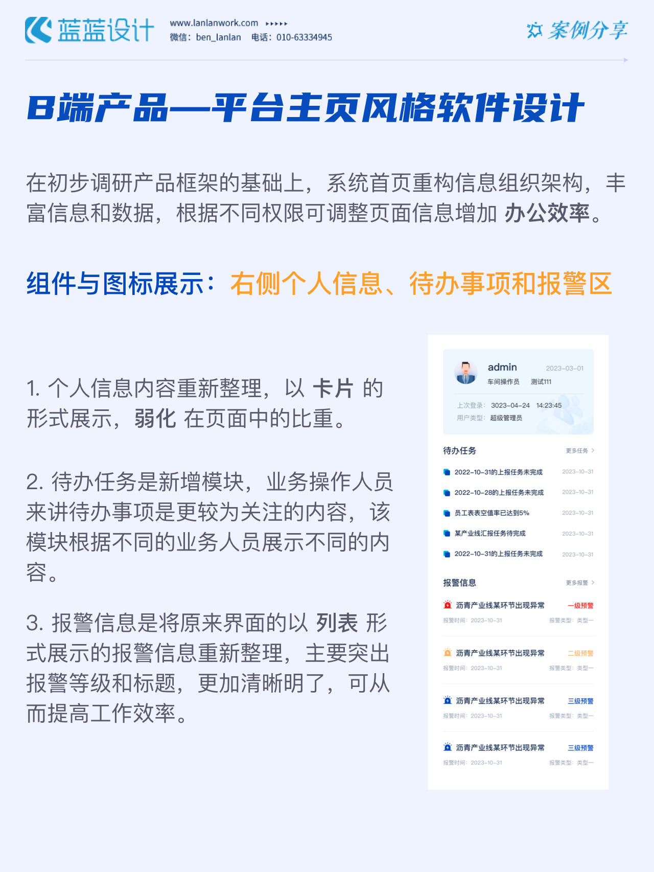 方案二:平臺(tái)主頁(yè)風(fēng)格 在初步調(diào)研產(chǎn)品框架的基礎(chǔ)上,系統(tǒng)首頁(yè)重構(gòu)信息組織架構(gòu),豐富信息和數(shù)據(jù),根據(jù)不同權(quán)限可調(diào)整頁(yè)面信息增加辦公效率。設(shè)計(jì)風(fēng)格采用簡(jiǎn)約的設(shè)計(jì)語(yǔ)言,模塊化布局,方圓并構(gòu)的設(shè)計(jì)模式,界面強(qiáng)調(diào)可復(fù)用性和通用性,配色采用品牌色,品牌融合度高。