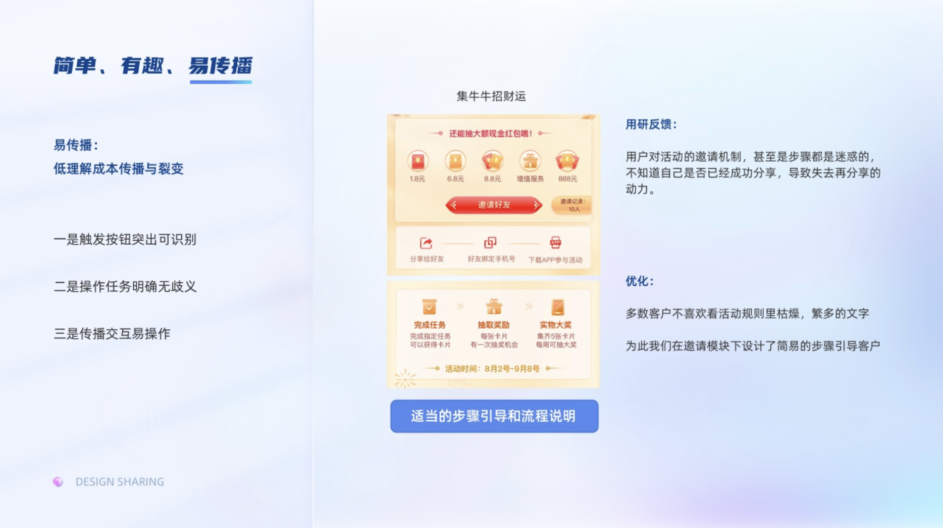 易傳播:是指低理解成本傳播與裂變。一是觸發(fā)按鈕突出可識(shí)別;二是操作任務(wù)明確無歧義;三是傳播交互易操作。通常我們設(shè)計(jì)的時(shí)候會(huì)理所當(dāng)然感覺用戶是很明確他們的操作行為的,但是基于某證券一期的活動(dòng)用研反饋,用戶對活動(dòng)的邀請機(jī)制,甚至是步驟都是迷惑的,不知道自己是否已經(jīng)成功分享,導(dǎo)致失去再分享的動(dòng)力,為此我們在邀請模塊下設(shè)計(jì)了簡易的步驟去引導(dǎo)客戶。