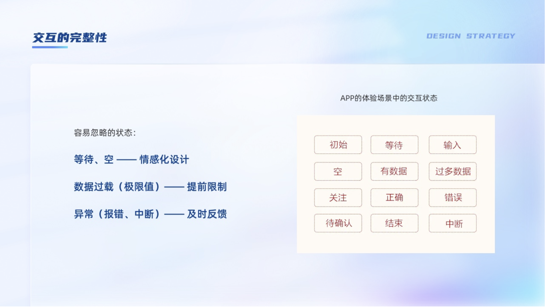 交互狀態(tài)都要考慮全面,如登錄前后狀態(tài),空狀態(tài),各個(gè)等級的狀態(tài),任務(wù)前后的狀態(tài),不同類別用戶的狀態(tài)等。