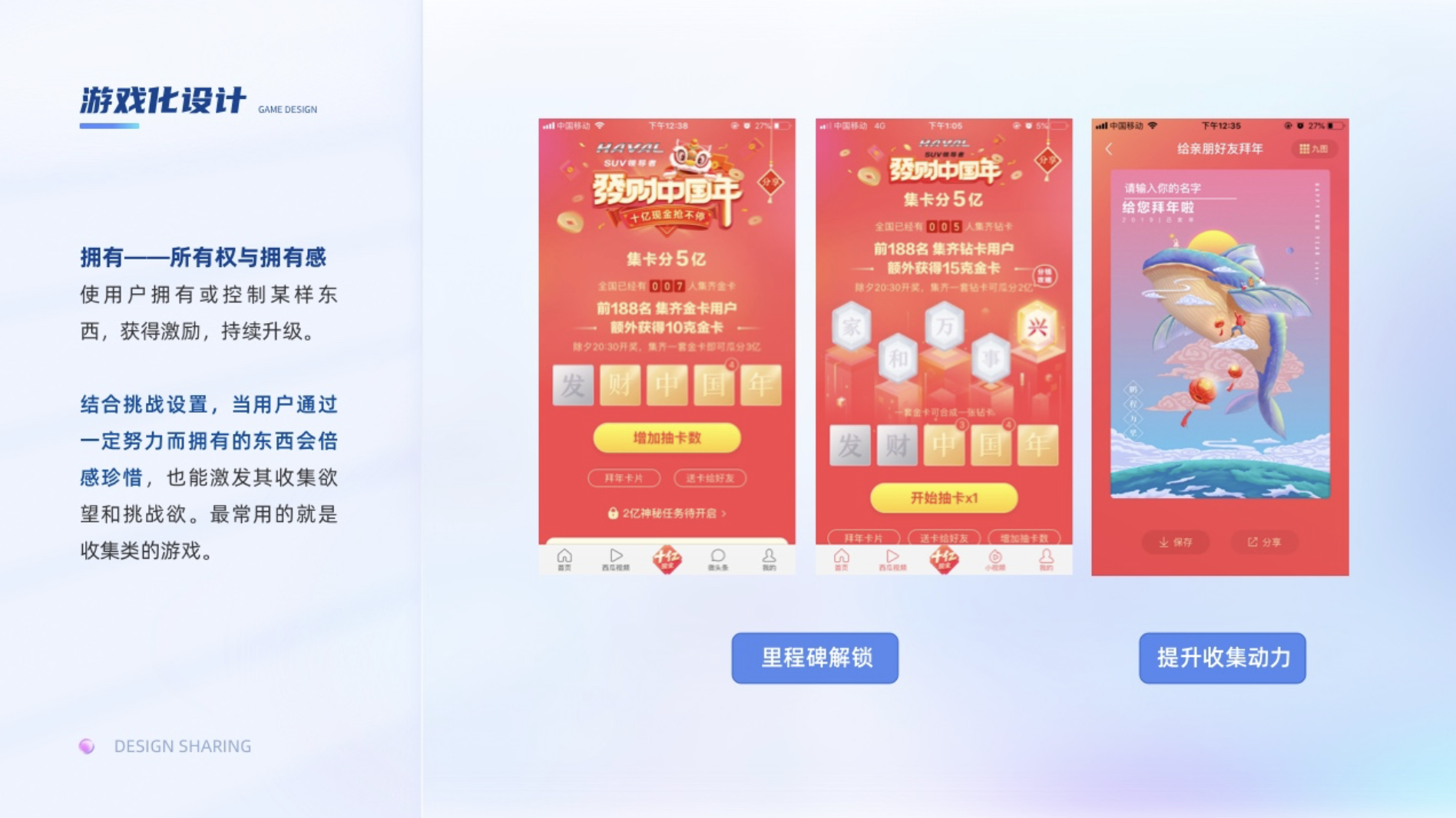 使用戶擁有或控制某樣?xùn)|西,獲得激勵(lì),持續(xù)升級。結(jié)合挑戰(zhàn)設(shè)置,當(dāng)用戶通過一定努力而擁有的東西會(huì)倍感珍惜,也能激發(fā)其收集欲望和挑戰(zhàn)欲。最常用的就是收集類的游戲,比如各種收集類的活動(dòng)中,先會(huì)獲得一個(gè)物品激發(fā)你對該系列的占有欲,不斷收集其他款。還有一種常用的是勛章的激勵(lì),勛章本身是對行為的階段性的獎(jiǎng)勵(lì),好的策略和勛章樣式同樣能激發(fā)用戶的收集欲。