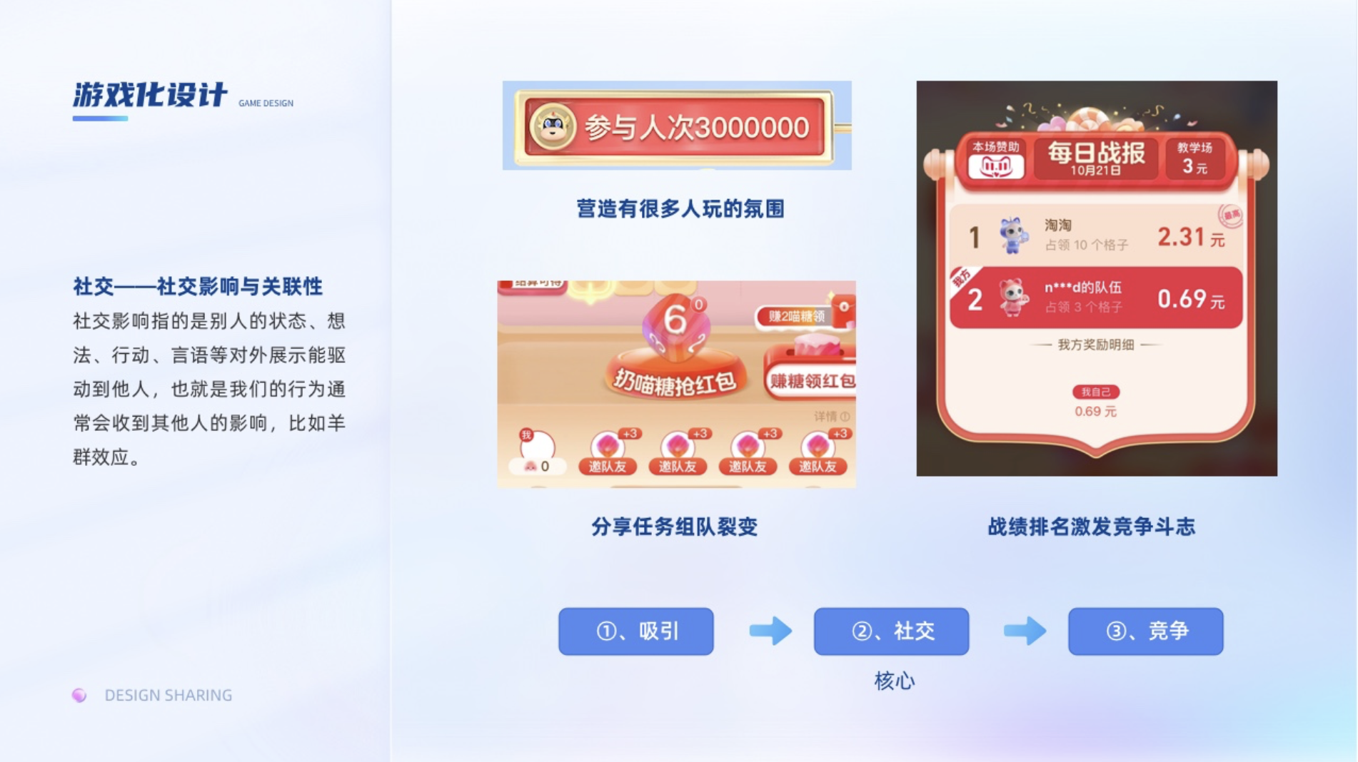 社交影響指的是別人的狀態(tài)、想法、行動(dòng)、言語等對外展示能驅(qū)動(dòng)到他人,也就是我們的行為通常會(huì)收到其他人的影響,比如羊群效應(yīng)。就像看抖音,點(diǎn)贊量多的,沒準(zhǔn)我們會(huì)跟有耐心看到最后,因?yàn)橛袀€(gè)潛意識(shí)心理就是大家都覺得好,總之差不到哪里去。在游戲和運(yùn)營活動(dòng)中,營造有很多人玩的氛圍,鼓勵(lì)用戶炫耀自己的成果都是非常見效的方式。關(guān)聯(lián)性我理解為我們會(huì)選擇盡可能與我們有關(guān)聯(lián)的事物。比如拼多多推薦你去分享,都是優(yōu)先推薦與你互動(dòng)最為頻繁的,這樣去拼單和拼單成功的幾率更高。
