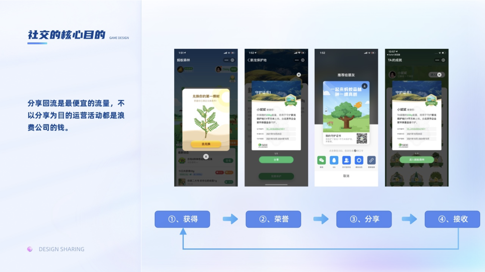 指參與過程中取得進(jìn)步、獲得技能、獲得榮譽(yù),從而獲得成就感,去克服困難達(dá)成目標(biāo)。一般我們會(huì)通過證書,勛章,排行榜等去給與用戶成就獎(jiǎng)勵(lì)。挑戰(zhàn)和技能是促使用戶不斷升級的主要因素,為了讓用戶沉浸其中護(hù)住心流,適當(dāng)?shù)奶魬?zhàn)難度和技能解鎖就顯得尤為重要。挑戰(zhàn)難度高了容易引起用戶的焦慮,難度低了又會(huì)讓用戶感覺無聊。比如集卡行動(dòng),在考慮總預(yù)算不變的情況下,如何設(shè)置稀有卡的比例,集卡的難度就尤為重要。支付寶集五福在初期,敬業(yè)福的比例比較低,所以用戶抽到敬業(yè)福的體驗(yàn)就很開心,但隨著支付寶后面為了擴(kuò)大社交屬性,提高了集齊率,集五到五福的興奮感就弱了,導(dǎo)致部分用戶失去動(dòng)力,因?yàn)榧降娜嗽蕉嗪罄m(xù)瓜分的錢就越少。
