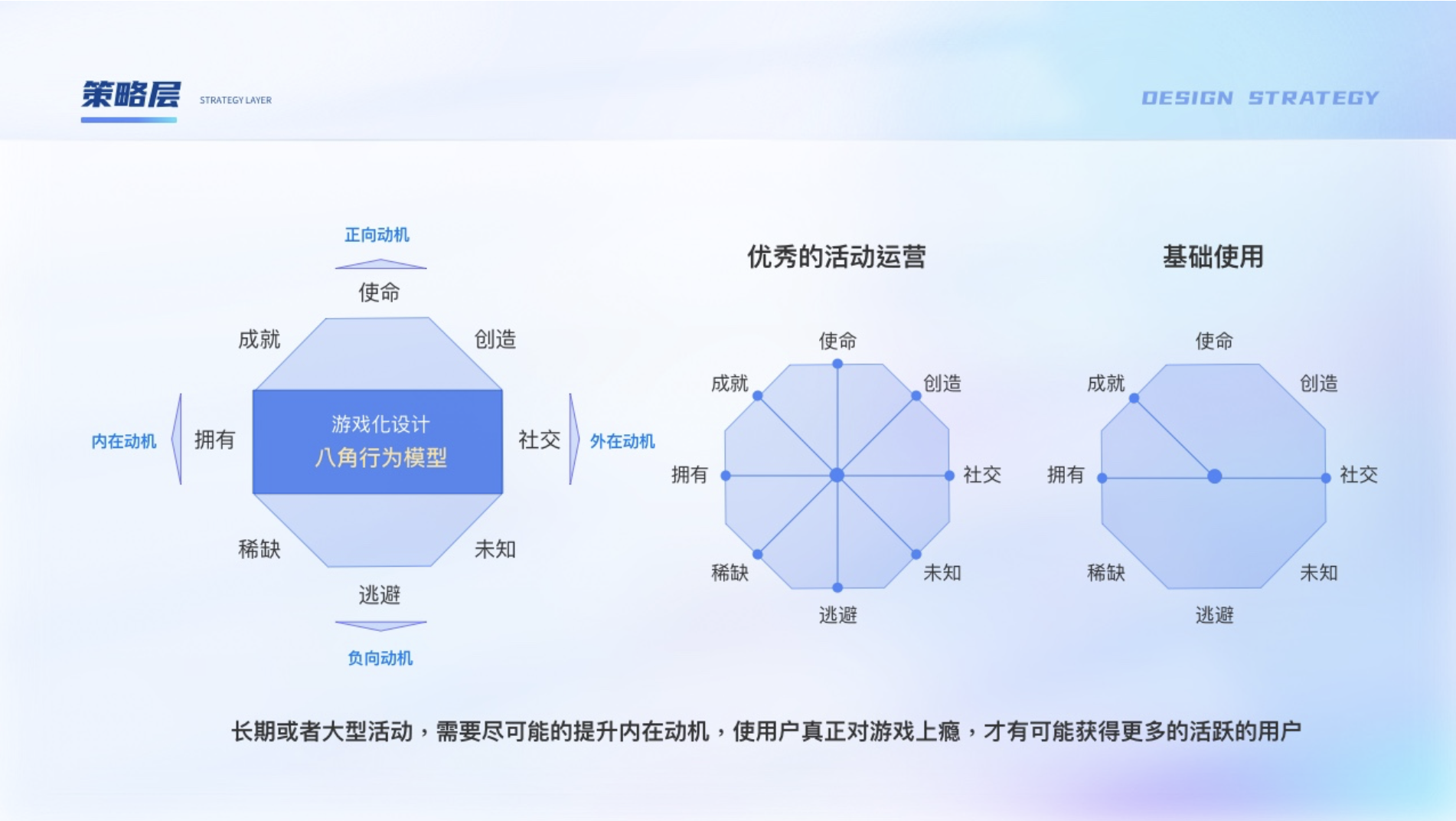 由于游戲本身對用戶就有一種天然的吸引力,加上可以很好的與運(yùn)營活動(dòng)結(jié)合打造沉浸式體驗(yàn),越來越多活動(dòng)都是與游戲結(jié)合來達(dá)到活動(dòng)目標(biāo),也叫運(yùn)營的游戲化。核心宗旨是“以人為本”的設(shè)計(jì)理念,并不是以功能為中心,在設(shè)計(jì)時(shí)可以使用游戲化設(shè)計(jì)八角模型。