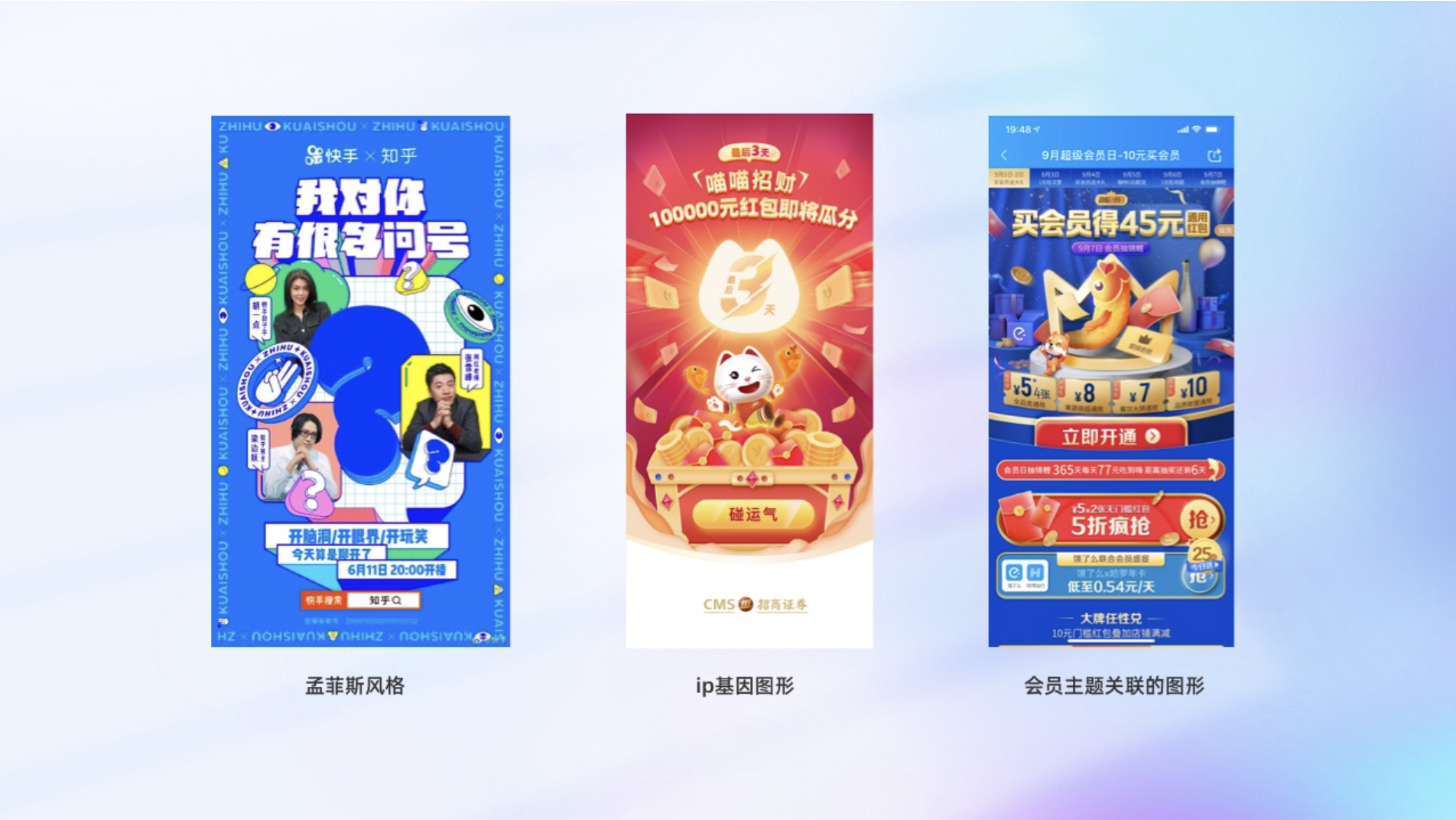 圖形:圖形分為大塊面圖形和點(diǎn)綴性圖形,大塊面的圖形使用可以很好的起到第一眼營銷的作用,比較適合創(chuàng)意圖形;點(diǎn)綴性圖形比較適合提升活動(dòng)的氛圍,提升局部的質(zhì)感,還可以給人一種潤物細(xì)無聲的精細(xì)感。