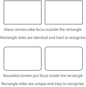 尖角指向外側(cè),會(huì)降低矩形內(nèi)部?jī)?nèi)容的視覺(jué)焦點(diǎn)。當(dāng)兩個(gè)矩形相鄰時(shí),尖角也使得難以區(qū)分矩形的兩邊。這是因?yàn)榫匦蔚拿織l邊都是直線。圓角矩形的邊是獨(dú)一無(wú)二的,因?yàn)檫@些線條會(huì)向其所屬的矩形彎曲。