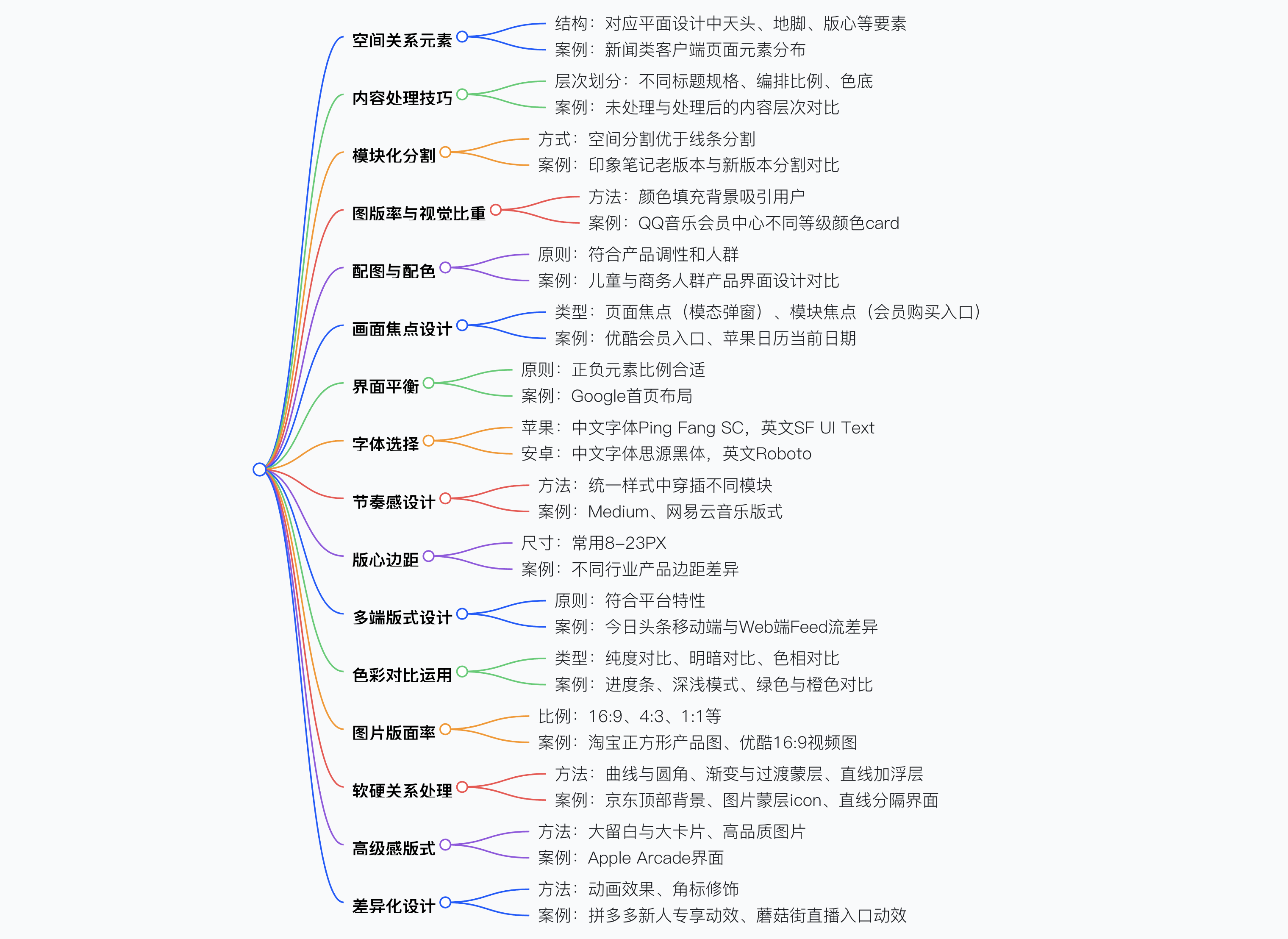 UI 界面版式設(shè)計(jì)的實(shí)用技巧,包括運(yùn)用平面設(shè)計(jì)結(jié)構(gòu)理解界面空間元素分布,通過不同標(biāo)題規(guī)格等處理內(nèi)容過多問題,采用空間分割替代線條分割,利用顏色填充背景改變圖版率,根據(jù)產(chǎn)品調(diào)性選擇配圖及配色,通過模態(tài)彈窗等突出畫面焦點(diǎn),注重界面平衡,選擇合適字體(蘋果常用 Ping Fang SC、SF UI Text 等,安卓常用思源黑體、Roboto 等),設(shè)計(jì)有節(jié)奏感的版式,參考常用版心邊距(8-23PX),考慮多端平臺特性進(jìn)行版式設(shè)計(jì),運(yùn)用純度、色相對比等色彩對比手法,有效利用 16:9 等圖片版面率,通過曲線與圓角等處理版式軟硬關(guān)系,利用大留白與大卡片營造 “高級感”,采用增加動(dòng)畫效果等差異化設(shè)計(jì)方法。