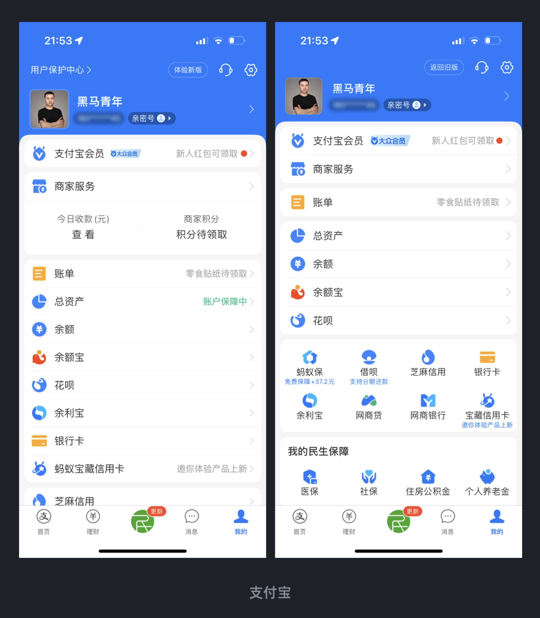 支付寶新版?zhèn)€人中心優(yōu)化布局,將原列表布局改為列表與宮格結合的形式,使更多功能在首屏曝光,既提高了版面利用率,也讓用戶操作更快捷。