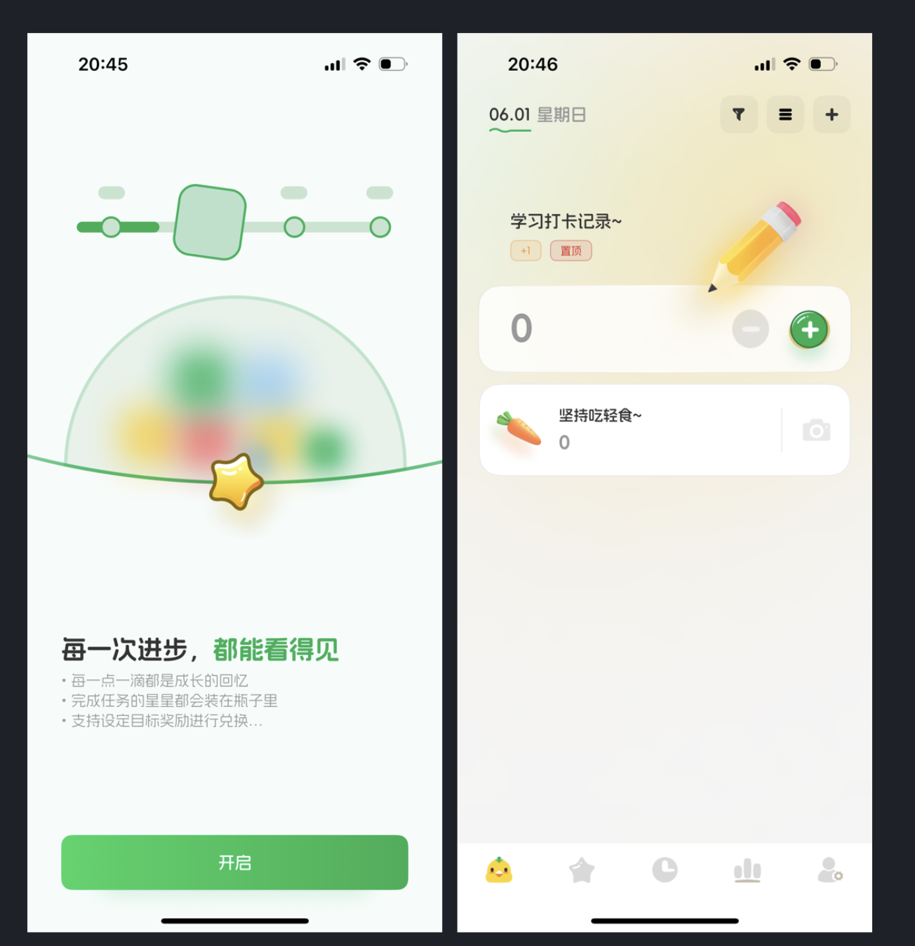 “星習慣” App 集習慣養(yǎng)成、學習打卡、生活記錄等功能于一體,其 UI 設計區(qū)別于大眾化風格,符合年輕用戶審美,交互邏輯也值得學習,用戶可通過完成任務收集 “星星”,還能設置目標獎勵等。