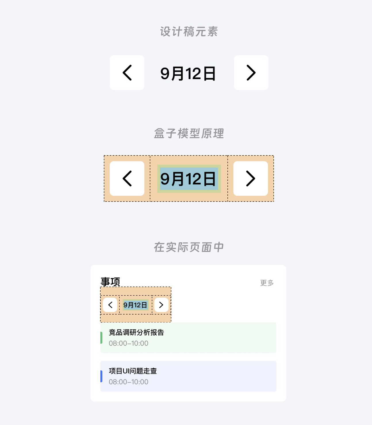 - 案例實操:以 “9 月 12 日” 的日程元素為例,其內(nèi)容(如事項名稱、時間)對應 content,內(nèi)容與邊框的距離為 padding,元素邊框為 border,與其他元素的間距為 margin。通過調(diào)整這些屬性,可讓元素按設(shè)計稿布局整齊排列。