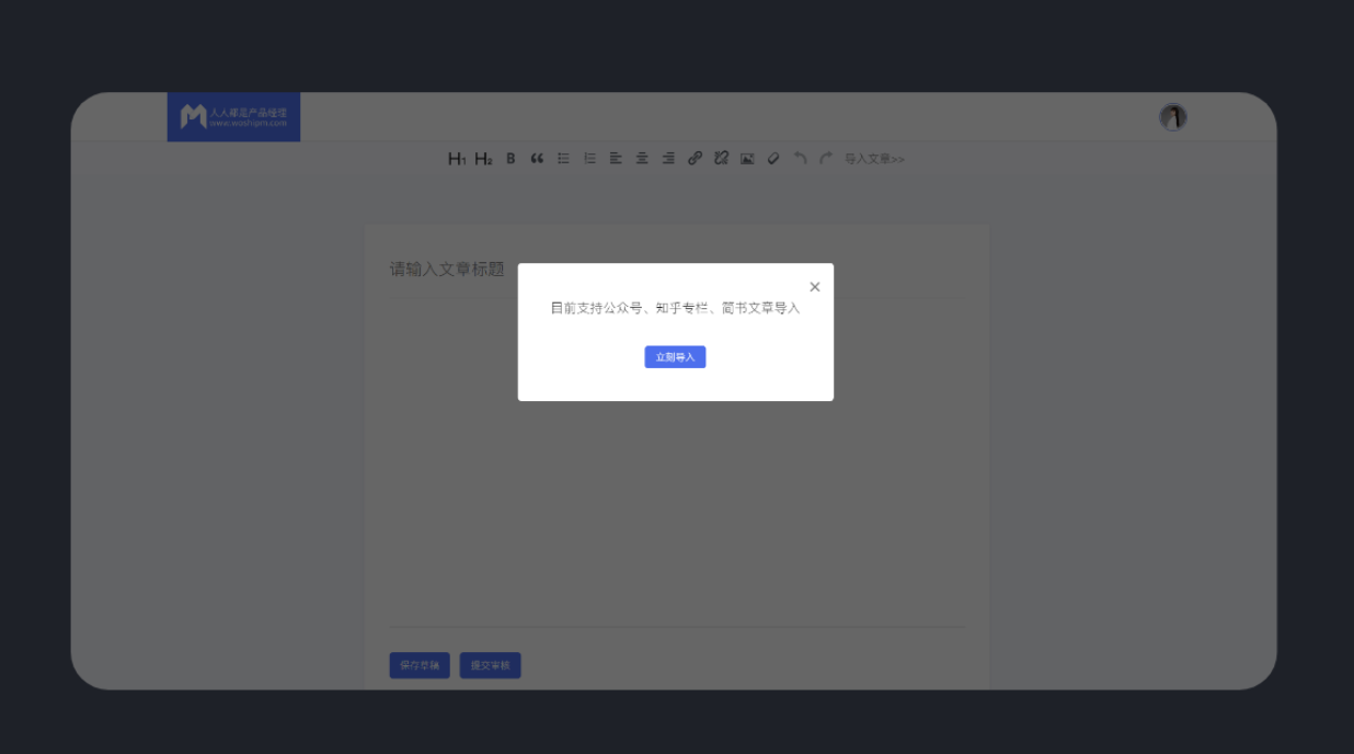 好用的 B 端產品能顯著提升用戶操作效率,讓工作如行云流水般順暢。反之,難用的產品就像用鈍刀切黃油,不僅效率低下,還會讓人心情煩躁。“人人都是產品經理” 的文章投稿發(fā)布頁面設置了文章導入功能,支持從公眾號、簡書、知乎專欄導入文章,大大節(jié)省了投稿人編輯文本和排版的時間,減少了重復排版的麻煩,也提高了人們的投稿意愿。