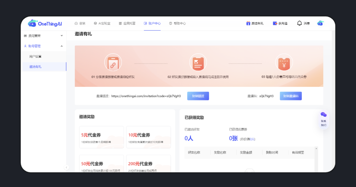 對于 SaaS 產品,在滿足業(yè)務場景的前提下,良好的體驗如同口碑的種子,會不斷生根發(fā)芽,讓更多人愿意付費并推薦給朋友,使產品像茁壯成長的樹一樣不斷吸引新養(yǎng)分。oneThingAI 推出的 “邀請有禮” 活動,會員推薦他人可獲得相應代金券,再加上工具本身體驗好、便捷易上手,在優(yōu)惠活動期間,吸引了眾多 AI 愛好者注冊購買,有效促進了產品銷量增長。