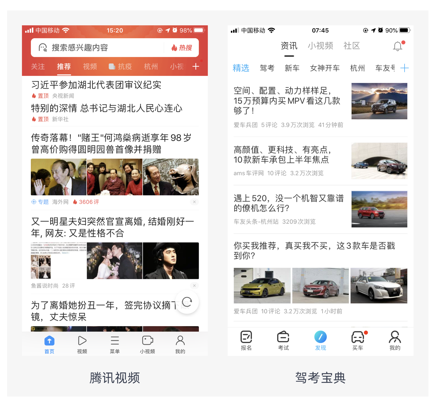 常見(jiàn)的布局方式有左右布局和上下布局,多用于新聞資訊類產(chǎn)品中。比如駕考寶典的資訊頁(yè)面,采用上下布局,每條資訊以標(biāo)題為主,搭配輔助圖片,讓用戶能快速了解內(nèi)容概要;騰訊視頻的資訊板塊則運(yùn)用左右布局,左側(cè)是標(biāo)題和簡(jiǎn)要內(nèi)容,右側(cè)是相關(guān)圖片,便于用戶快速篩選感興趣的信息。