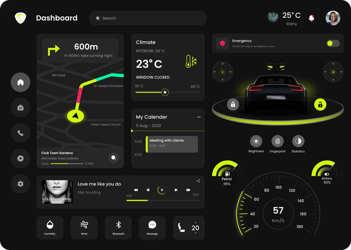 汽車中控是用戶出行的高頻交互場景,設計不僅要 “能用”,更要 “好用且愉悅”。這類界面將導航、車況、娛樂等功能整合,深色主題搭配熒光黃交互元素,既避免強光干擾駕駛,又讓操作區(qū)清晰可辨。實時路況、車輛能耗的直觀展示,音樂播放的便捷控制,都圍繞 “駕駛場景下的高效交互” 展開。這和我們的設計理念不謀而合 —— 科技產(chǎn)品的 UI,應模糊 “工具” 與 “伙伴” 的邊界,讓每一次使用都成為舒適的體驗。