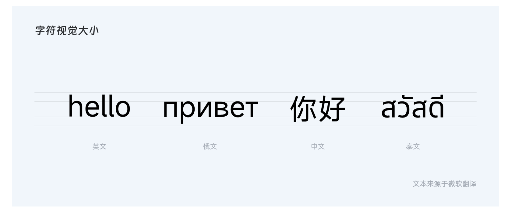 同一字號(hào)下,漢字的視覺感受明顯大于拉丁字母,而泰文則更小。比如 16 號(hào)字的 “你好”,視覺寬度相當(dāng)于 16 號(hào)字 “Hello” 的 1.5 倍,這會(huì)直接導(dǎo)致按鈕、標(biāo)簽的 “視覺擁擠度” 差異 —— 中文按鈕 100px 寬足夠,英文可能需要 120px,俄文則需要 150px。