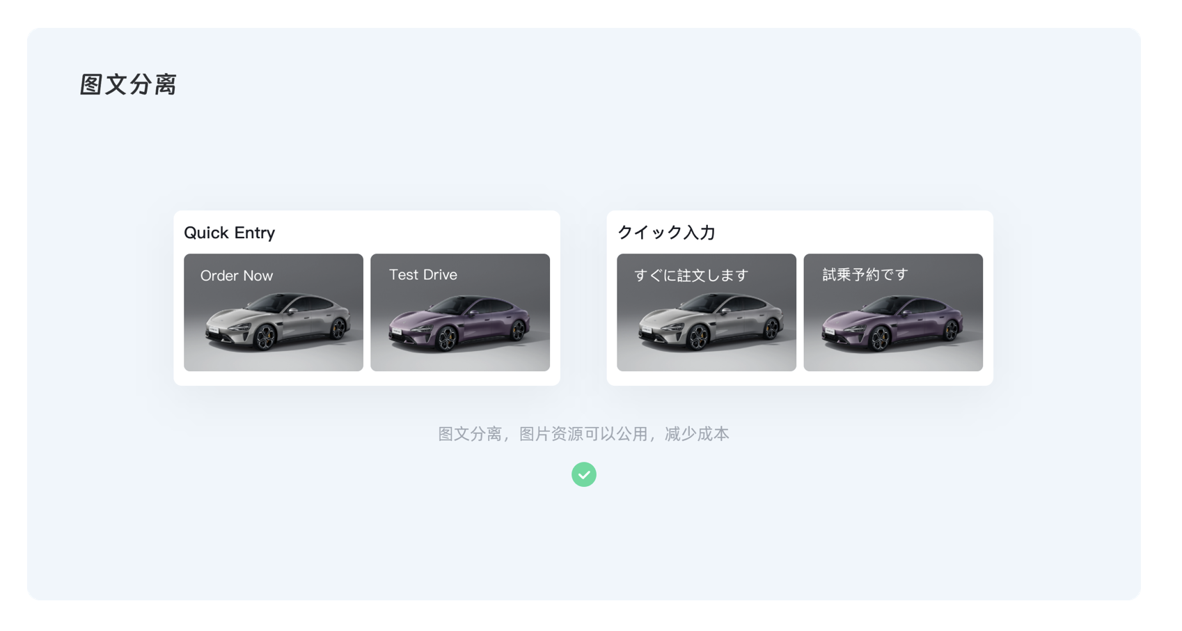- 文本單獨(dú)用代碼實(shí)現(xiàn):圖片作為背景,文本用代碼調(diào)用不同語言的字符串(如中文 “立即下單”、英文 “Order Now”),一張圖片適配所有語言。