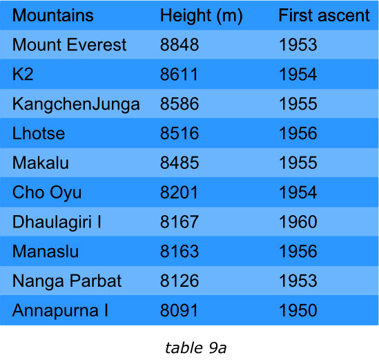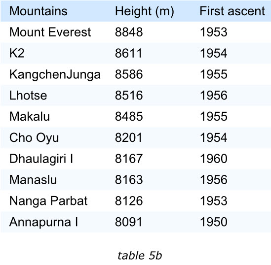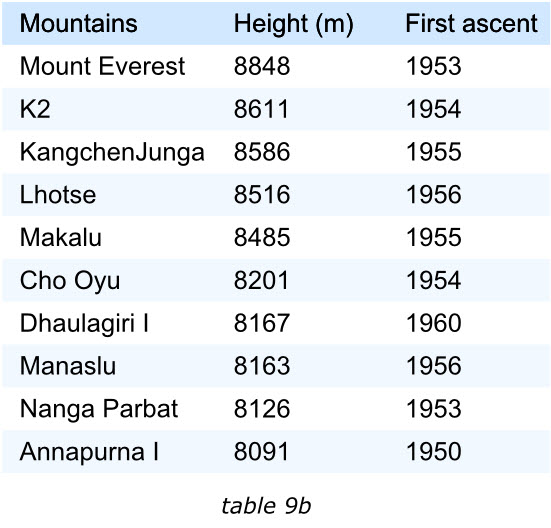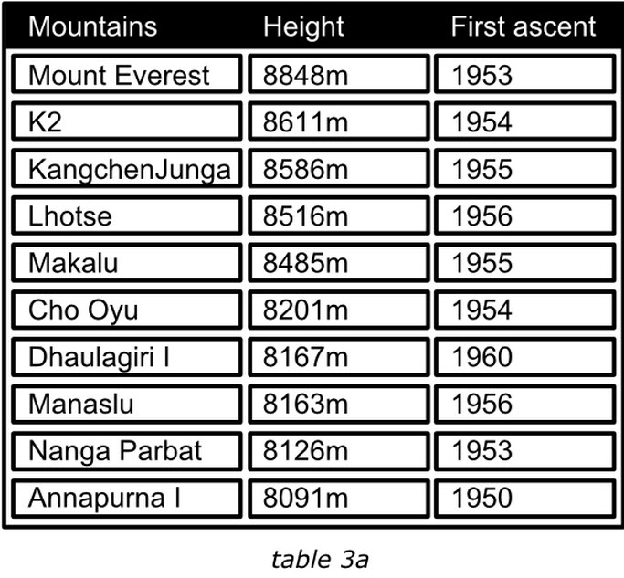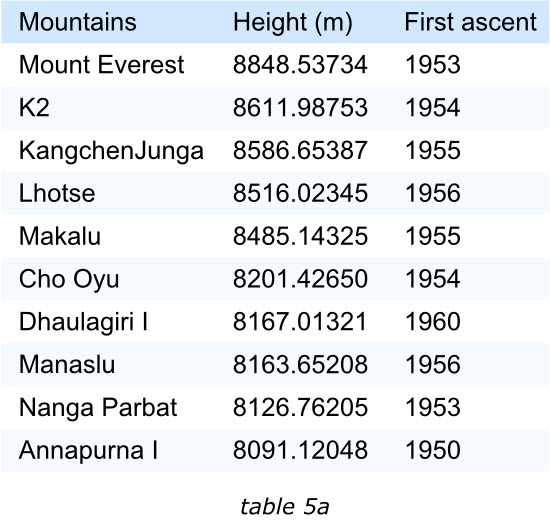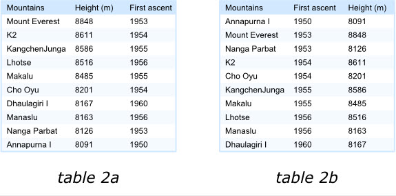 表格中的項目應(yīng)該通過某種排序的手段來滿足閱讀者的興趣。我們來看下面的兩個表格,左面的展示了世界上最高的十座山峰,鑒于“高度”最受關(guān)注,那么表格的項目就是按照這個字段降序排列的。這樣最受關(guān)注的信息能夠排在表格的最前面。