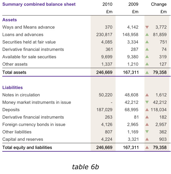 在英格蘭銀行2010年度報告中,盡管我們不能通過改變數(shù)據(jù)來達(dá)到讀者的期望,但是在其他同樣的報告中,我們在末尾增加一列有用的數(shù)據(jù),以避免用戶在比較各年度數(shù)據(jù)的時候,還需要自行計算增長或減少的幅度。下面第一個表格6a已經(jīng)增加了總資產(chǎn)和總負(fù)債數(shù)據(jù),而表格6b則在右側(cè)增加了新的一列,使我們更容易分析出哪些領(lǐng)域的經(jīng)營成果發(fā)生了實質(zhì)性變動。