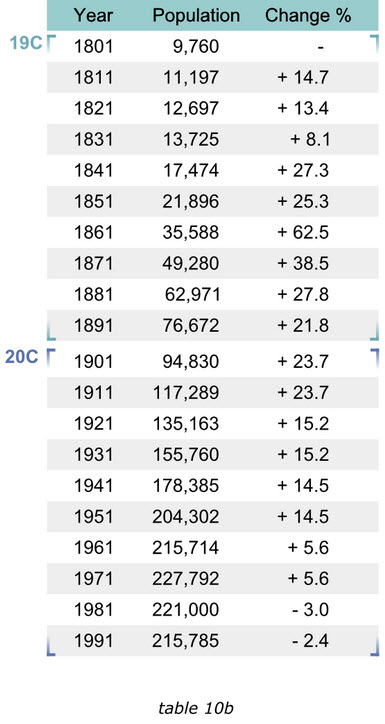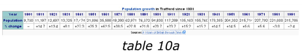 當(dāng)我們在撰寫wikipedia上的Trafford條目時,有一個1801至1991年的人口變化表格10a,他包含有2行20列,讀者必須記住有關(guān)信息,并且不停的對照表頭和數(shù)值來確認(rèn)他們的關(guān)系,否則他們就無法獲得趨勢信息。