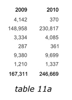 在表格10a和10b中我們已經(jīng)了解到,當(dāng)數(shù)據(jù)處于一列的時候,人們很容的可以比較數(shù)據(jù)并發(fā)現(xiàn)趨勢。瀏覽者可以快速的從上之下掃描縱向數(shù)據(jù),而對于長距離的橫向數(shù)據(jù),瀏覽就會遇到困難。然而我們再來看一下表格11a,去掉了所有的裝飾框,當(dāng)我們比較2009年和2010年數(shù)據(jù)的時候,數(shù)據(jù)橫向擺放要比11b中的上下擺放容易的多。