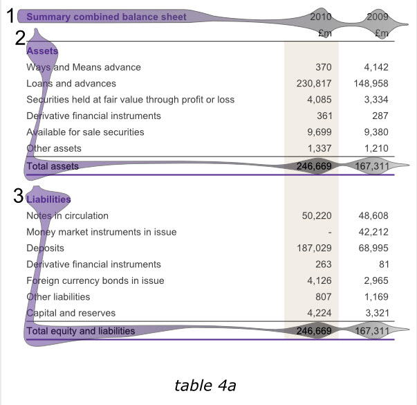 在表格中尋找信息時,讀者希望前后采用同樣風(fēng)格,你應(yīng)該保證對同類元素使用同樣的字體,對同類數(shù)據(jù)使用同種對齊方式,還有諸如“列標(biāo)題”等各種突出顯示元素的一致性??匆幌孪旅娴谋砀?a,他展示了和前面表格1b同樣的英格蘭銀行2010年度數(shù)據(jù)信息。但是使用了有區(qū)分的表頭字體,標(biāo)簽以及加總格式,表頭采用了居中格式而不是和數(shù)據(jù)一樣右對齊,加總數(shù)據(jù)也沒有與數(shù)據(jù)嚴(yán)格對齊,同時為了區(qū)別資產(chǎn)和負(fù)債表格,他分別采用了不同顏色的字體,和表格中間粗細(xì)不同的線條。而所有這些實際上都讓我們產(chǎn)生一種不連貫的感覺,從而給瀏覽表格,把握重點帶來難度。