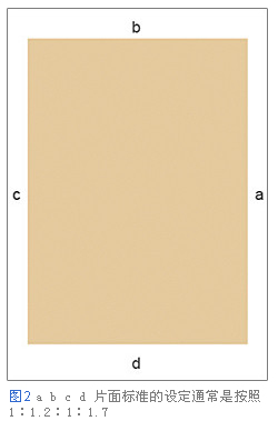 首先在書籍編排過程中,設定頁面四周的余白來安排頁面的排版。頁邊空白的大小不同,排版效果給讀者帶來的印象也會發(fā)生變化,因此需要適當?shù)剡M行處理。雖然紙質書籍已經(jīng)有了莫里斯所提倡的版面設定理論,但是這些理論并不適合于顯示在硬件設備上。因此我們需要根據(jù)不同的媒體特點來進行處理。如圖(2) 有顏色的部分是版面,abcd版面標準的設定通常是按照1:1.2:1:1.7的比例來進行設計。