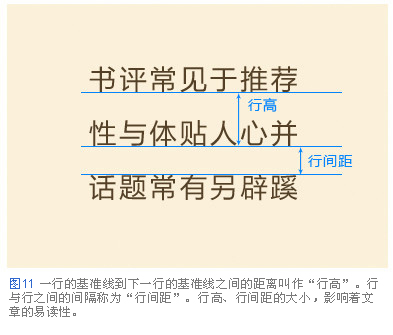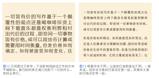 行高,行間距的大小對文章的易讀性有很大的影響。行與行之間拉得過開,從一行末尾移動到下一行開頭,視線的移動距離過長增加了閱讀難度。相反,行與行之間貼得過緊,上下挨得過緊影響了視線的移動,讓人不知道正在閱讀哪一行(圖12)。正文最恰當?shù)男懈?,基本應該設定為其文章中文字大小的兩倍。例如文字大小為8px的文章,就應該把行高設定為16px(圖13)