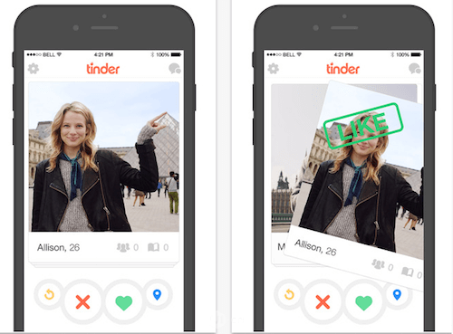 Tinder是一款交友軟件,其頁面設(shè)計的很簡單但是很精致。主體就是一張附近用戶的照片,你如果喜歡可以就向右滑動卡片,不喜歡就想左劃,就是這么簡單。很適合拇指操作。