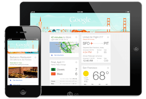 我們都知道你的app和網(wǎng)站在不同的設(shè)備下保持適配是一件很重要的工作。而卡片式設(shè)計就能很好的幫助我們來完成這一點。卡片式設(shè)計從根本上來說就是將頁面內(nèi)容進(jìn)行分解,然而再整合一個無法再進(jìn)行分解的元素。而響應(yīng)式設(shè)計要求的就是我們可以根據(jù)屏幕尺寸的大小對頁面內(nèi)容就行調(diào)整??ㄆ皆O(shè)計就可以對頁面內(nèi)容進(jìn)行分割重組來適應(yīng)不同的屏幕。比如這個Google在手機(jī)設(shè)備上顯示一個卡片,pad端顯示兩個卡片。