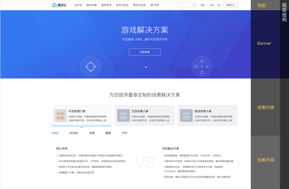(如下圖所示為常見網(wǎng)頁(yè)形態(tài)結(jié)構(gòu),整個(gè)頁(yè)面UI開發(fā)同學(xué)需要得到的其實(shí)是設(shè)計(jì)師確認(rèn)的框架結(jié)構(gòu),至于里面的圖標(biāo)、banner配圖、抑或是文字內(nèi)容都是可以后面提供的。具體來(lái)說,如下圖中,場(chǎng)景切換部分為三分陣列版式,灰色方框?yàn)閳D標(biāo)占位預(yù)留,UI開發(fā)同學(xué)只需要圖標(biāo)占位尺寸即可,圖標(biāo)細(xì)節(jié)和形態(tài),設(shè)計(jì)師在后面完成整體頁(yè)面框架后-上線前補(bǔ)齊即可。)